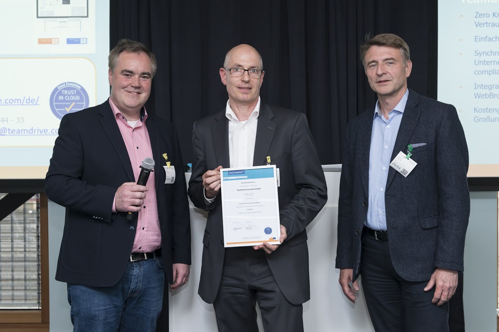 We are delighted to have been presented with the 50th “Trust in Cloud” seal of quality at the Google Cloud Conference in Munich. The seal, which is awarded by the Cloud Ecosystem Association, confirms that our sync & share service adheres to all the cloud-based service guidelines that are of importance to German businesses. These guidelines cover areas such as German data protection legislation, security aspects, service level, contractual arrangements, and other quality criteria that play a crucial role during the selection of cloud solutions in Germany.