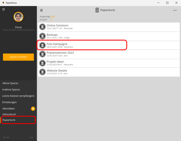 - Klicken Sie auf den gewünschten Space, um den Papierkorb des Space zu öffnen.