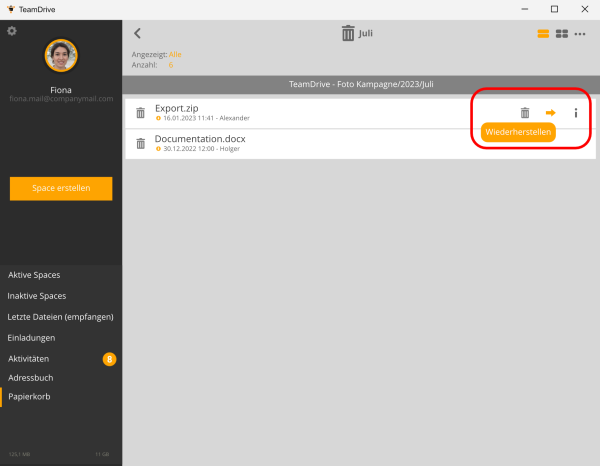 Um Dateien aus dem Papierkorb eine Spaces wiederherzustellen, gehen Sie bitte wie folgt vor: